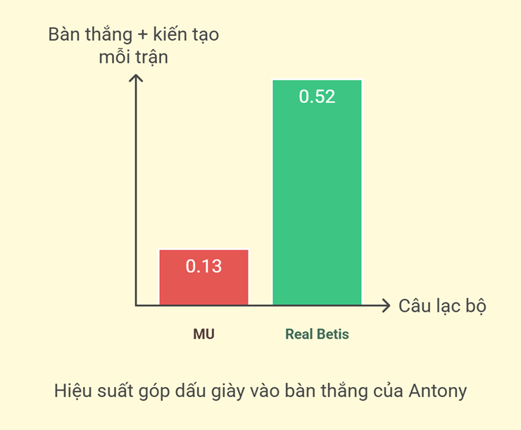 Kể từ khi gia nhập MU, Antony mới chỉ có 12 bàn và 5 kiến tạo sau 96 trận, một thành tích khá khiêm tốn so với kỳ vọng từ bản hợp đồng đắt giá của “Quỷ đỏ”. Với hiệu suất chỉ 0,13 lần đóng góp vào bàn thắng mỗi trận tại MU, so với 0,52 bàn mỗi trận tại Betis, rõ ràng Antony đang thể hiện một phong độ vượt trội khi thi đấu dưới màu áo đội bóng Tây Ban Nha. Sự khác biệt này cho thấy có thể Antony đã tìm thấy môi trường thích hợp để phát huy tối đa khả năng của mình, dưới sự dẫn dắt của HLV Pellegrini.
