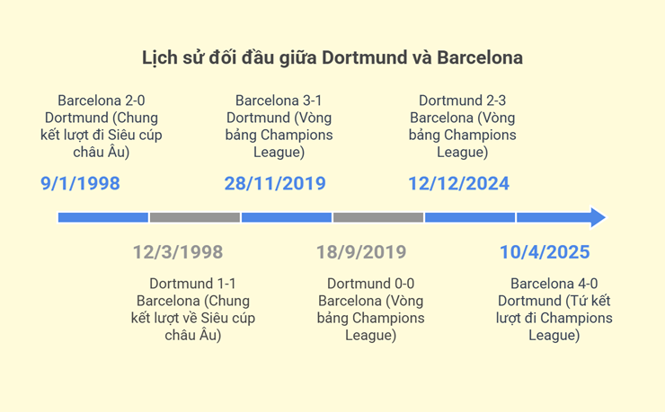 Thực tế, thành tích đối đầu giữa hai đội cũng hoàn toàn nghiêng về Barcelona. Trong 6 lần chạm trán trước đây, Dortmund chưa từng giành chiến thắng. Họ từng đối đầu Barca lần đầu tại Siêu cúp châu Âu mùa giải 1997/98 và nhận thất bại chung cuộc 1-3 sau hai lượt trận. Gần nhất, tại vòng bảng mùa giải 2019/20, dù cầm hòa Barca 0-0 trên sân nhà, nhưng sau đó lại để thua 1-3 tại Nou Camp với Lionel Messi là người trực tiếp gieo sầu.