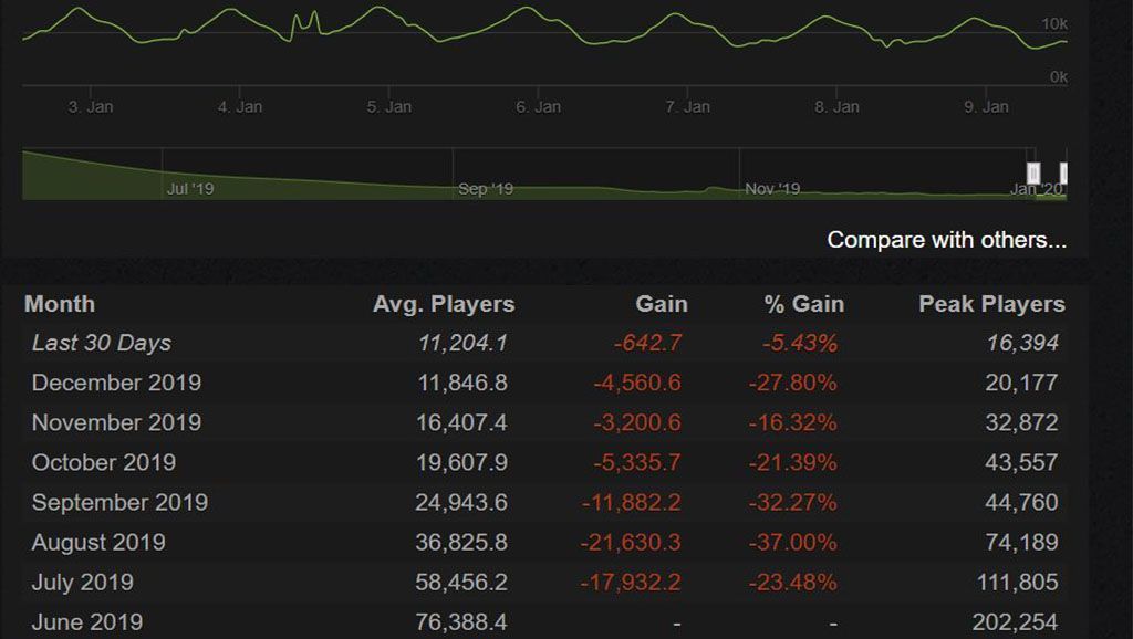 Từ vị trí đỉnh cao khi ra mắt, Underlords liên tục mất dần người chơi qua từng tháng. Hiện tại, số lượng người chơi cao nhất chỉ đạt hơn 16.000, giảm tới 90% so với con số ban đầu.