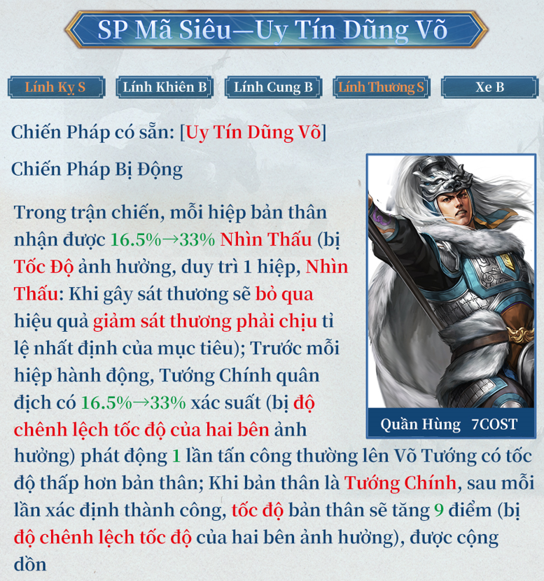 - SP Mã Siêu – Mãnh tướng có thể khiến Tào Tháo khiếp sợ.