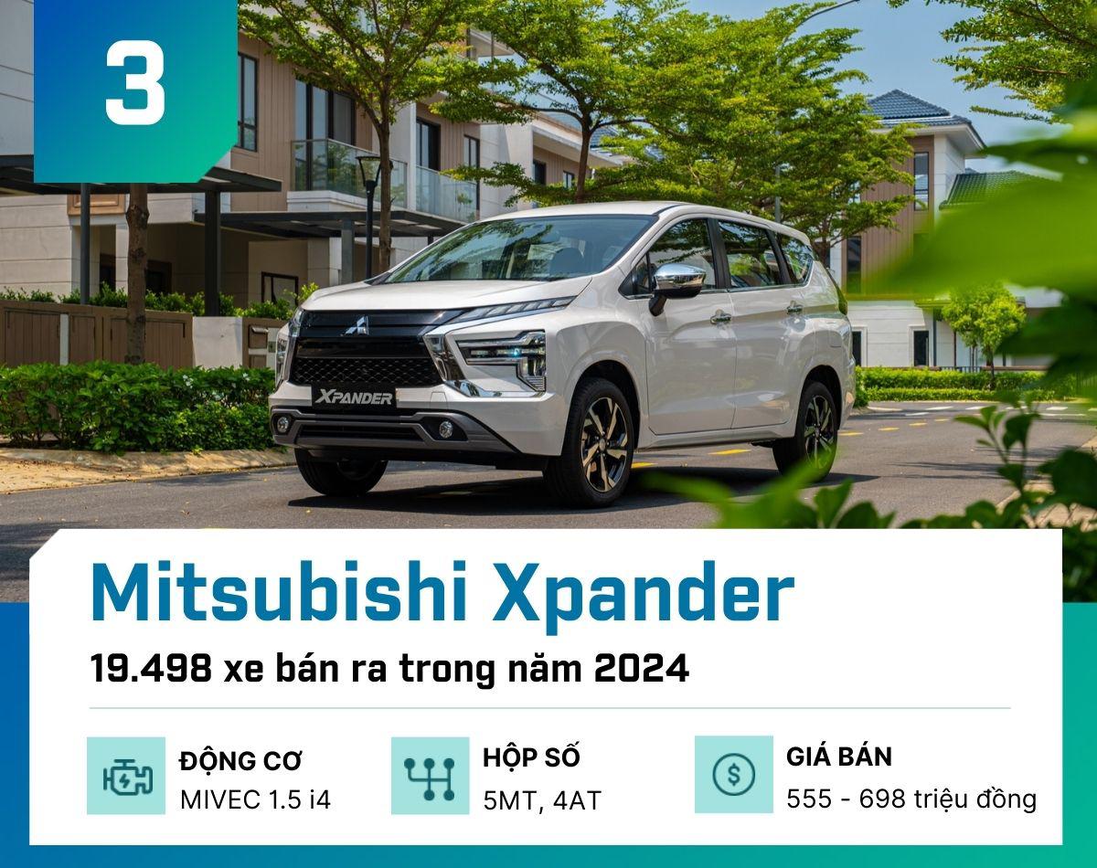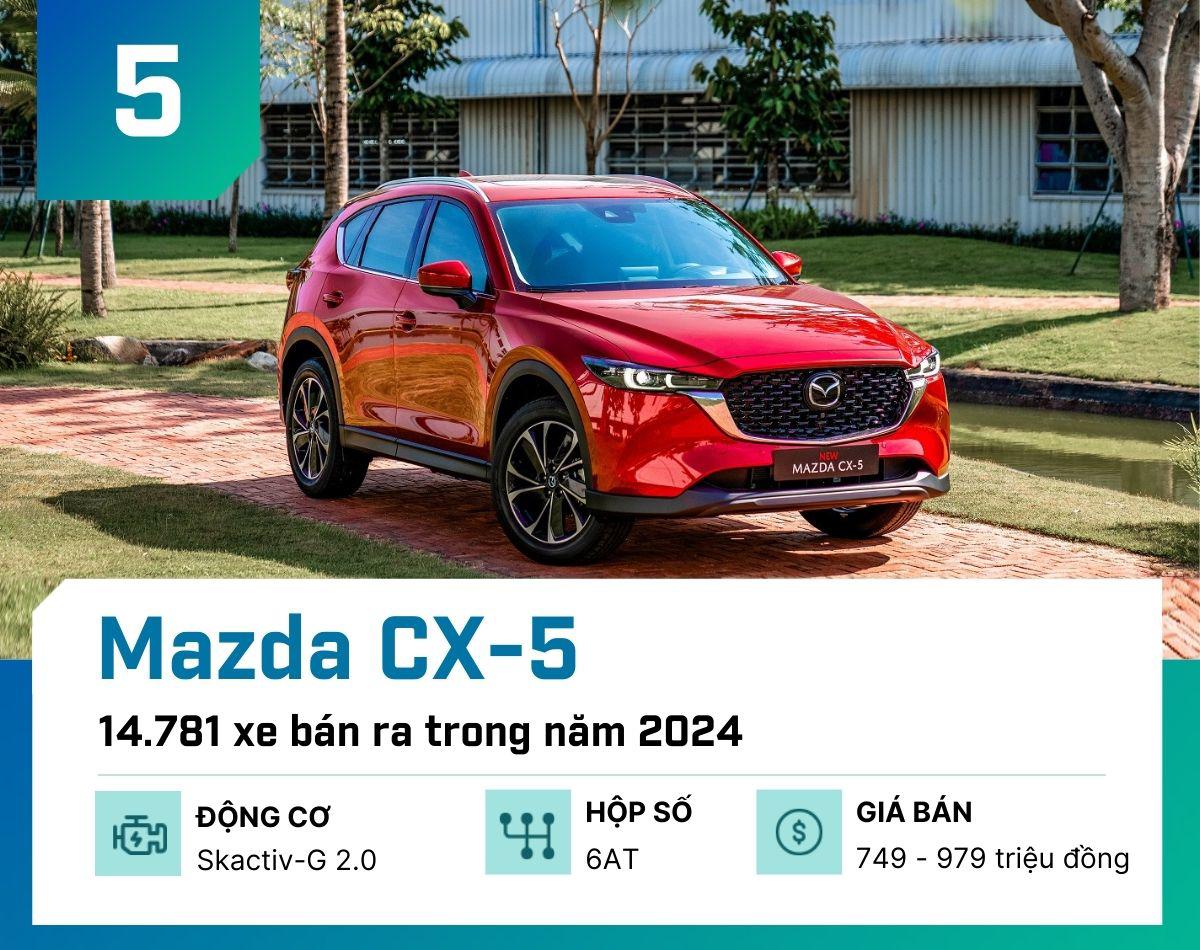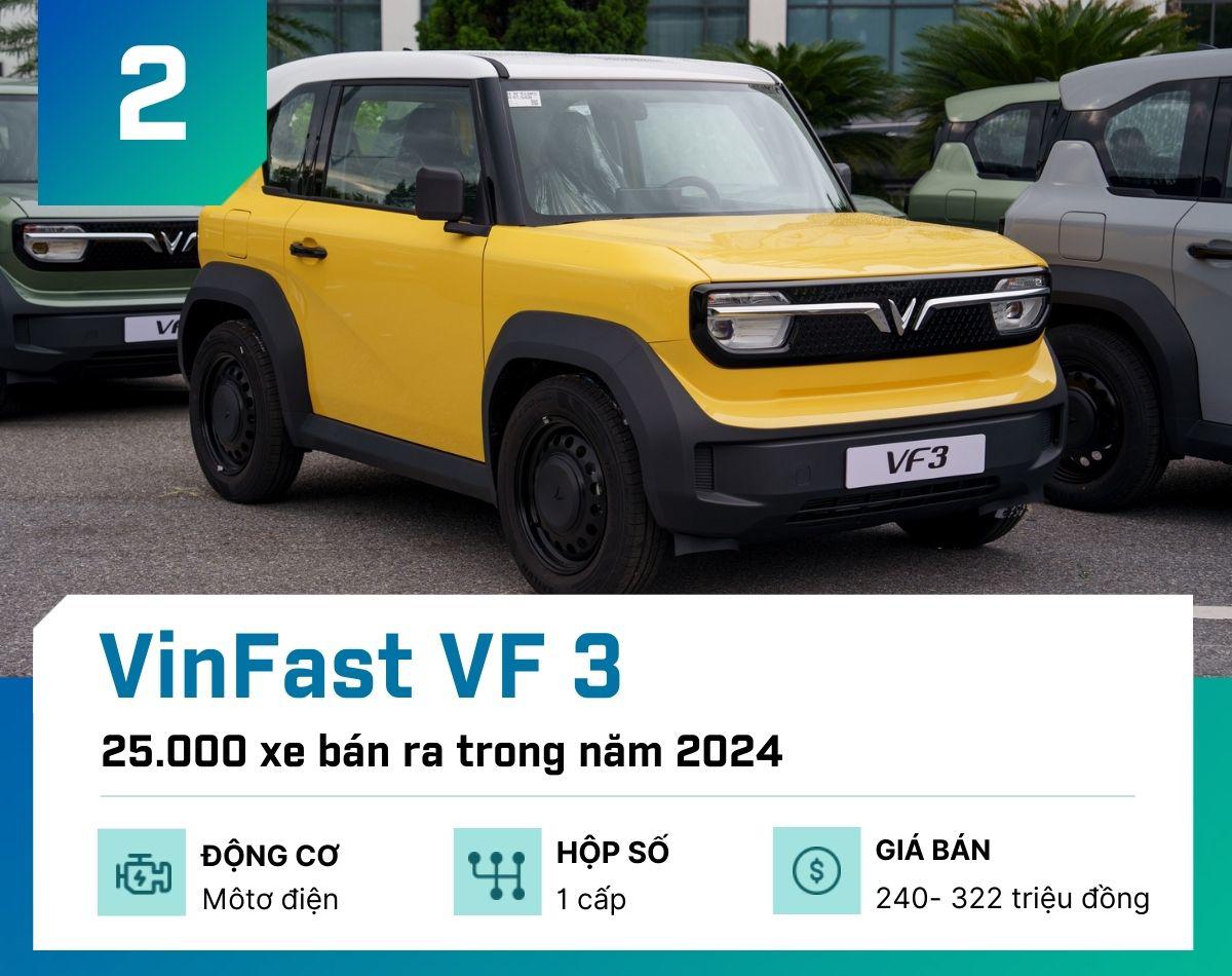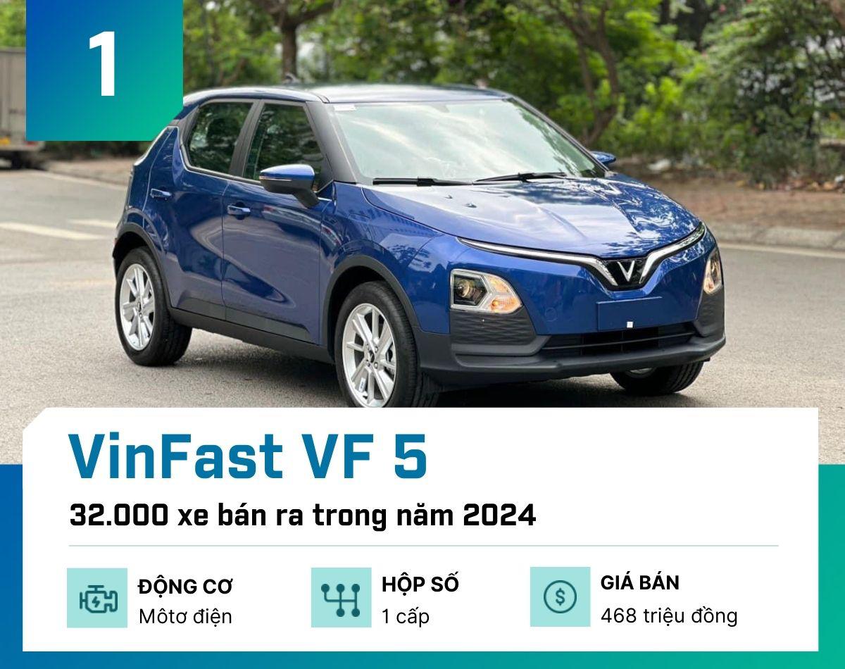 VinFast VF 5 – “Vua doanh số” 2024 VinFast VF 5 trở thành mẫu xe điện “made in Việt Nam” bán chạy nhất với hơn 32.000 xe. Đối với xe động cơ đốt trong, Mitsubishi Xpander, Ford Ranger và Mazda CX-5 giữ vị trí dẫn đầu. Đặc biệt, Mitsubishi Xforce lần đầu góp mặt trong danh sách.