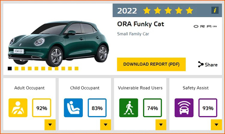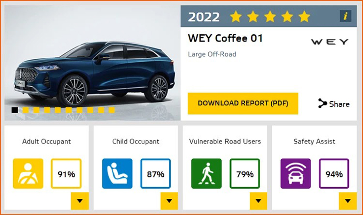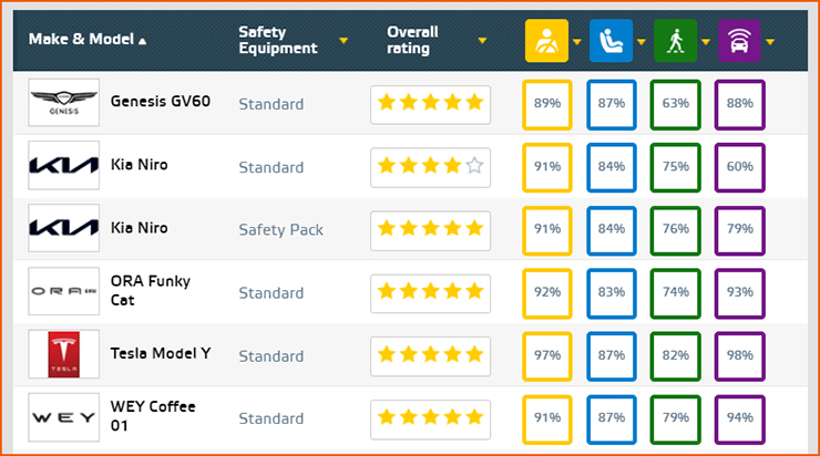 Điều bất ngờ là hai mẫu xe Trung Quốc – ORA Funky Cat và WEY Coffee 01 – cũng đạt 5 sao và có điểm số cao, thậm chí vượt qua Kia Niro trong một số hạng mục. Genesis GV60 của Hàn Quốc cũng đạt 5 sao nhưng không vượt trội hơn so với các đối thủ Trung Quốc.